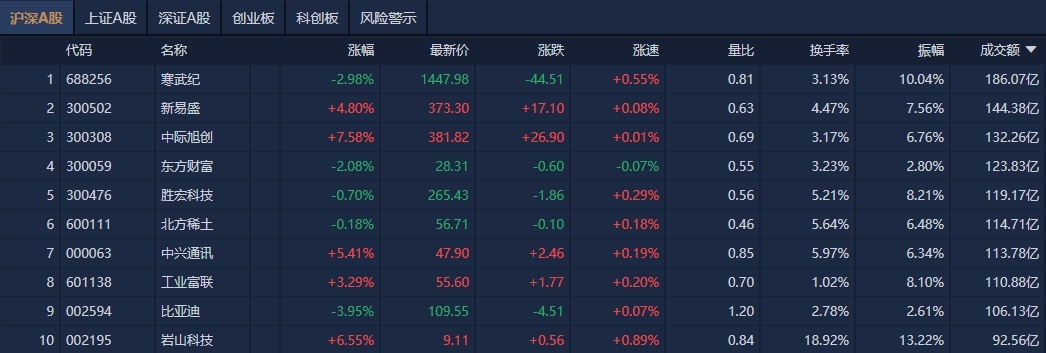 个股方面,寒武纪成交额超186亿元居首,新易盛、中际旭创、东方财富成交额靠前。
